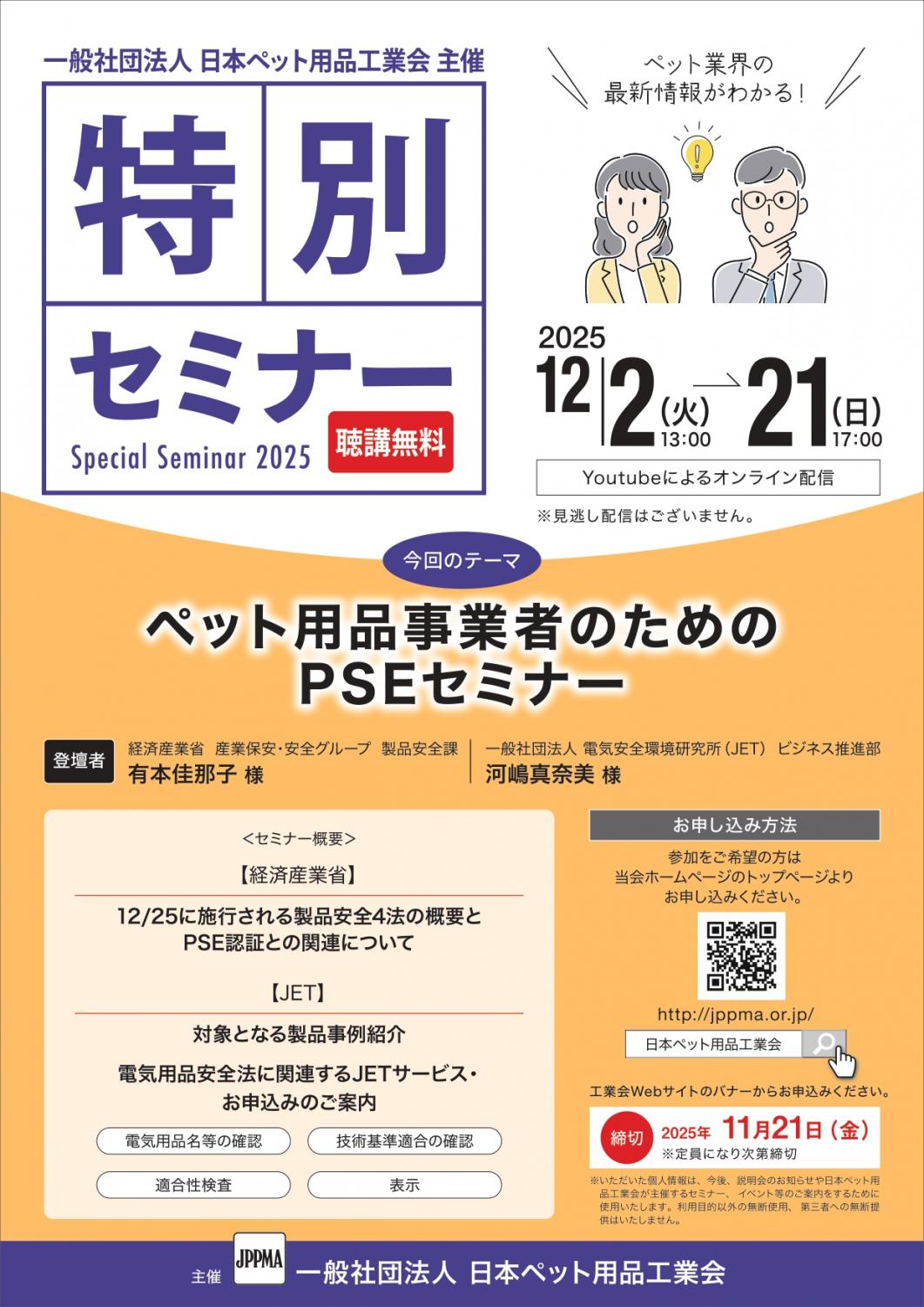 12月2日(火)~21日(日)開催 日本ペット用品工業会 特別セミナー 「ペット用品事業者のためのPSEセミナー」 参加お申込みフォーム ■以下の項目を入力し、[確認] ボタンをクリックしてください。 稀に返信内容が文字化けすることがございます。その際は事務局までご連絡くださいますようお願いいたします。 1. 内容のご記入2. 内容のご確認3. 内容の送信完了 [[_Form_]]